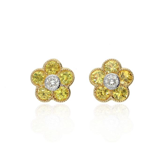 Circular faceted Yellow Sapphires, 0.51cts in total, with round briliant cut Diamonds, 0.07cts in total, reverse cluster stud earrings millegrain set in 18ct yellow and white gold.