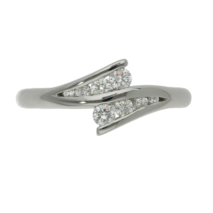 Two sets of graduated round brilliant cut Diamonds, 0.43cts in total, colour G, clarity VS, all channel set within a platinum flared crossover style ring.