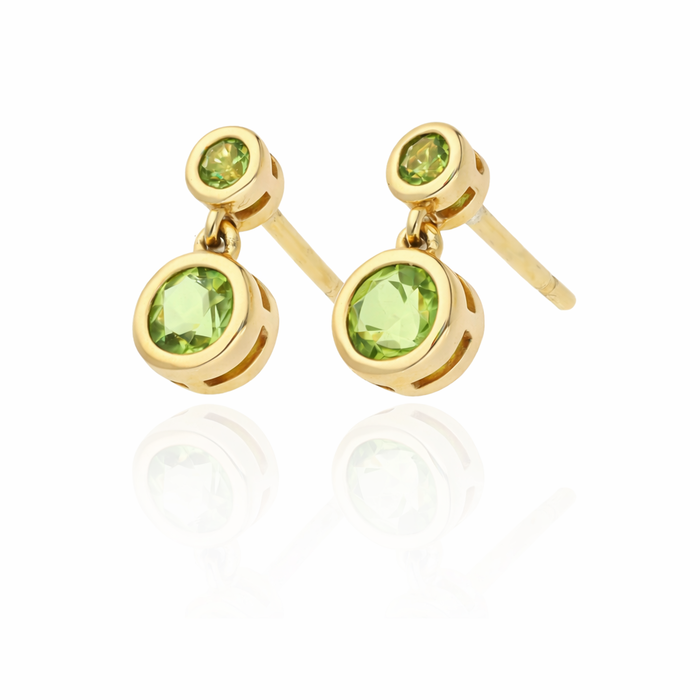 Peridot drop earrings rubover set in 9ct yellow gold. Two circular faceted peridot 0.68cts.