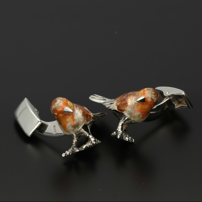A pair silver cast robin models with hand enamelled detail, swivel bar fittings.