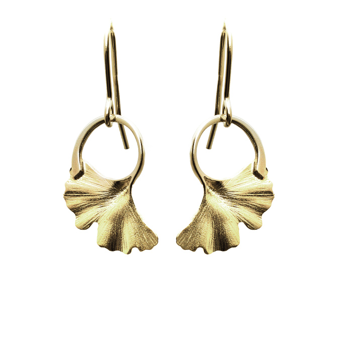 9ct yellow gold Ginkgo drop earrings, on hook fittings.