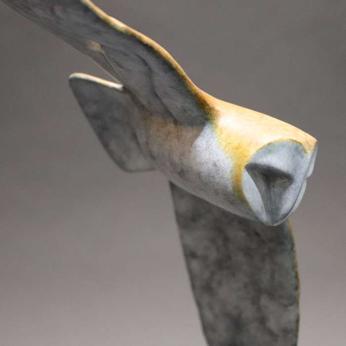Patinated bronze Barn Owl in flight, 40cm high.