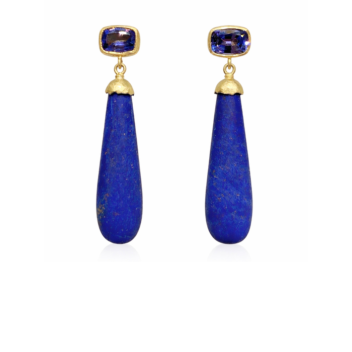 Earrings; Lapis 20cts & Tanzanite 2.65cts drops in 18ct yellow gold.