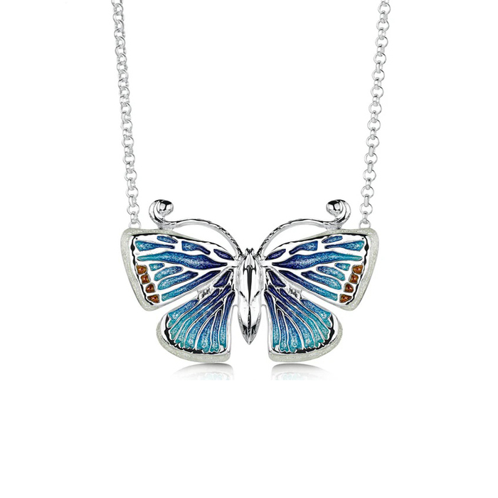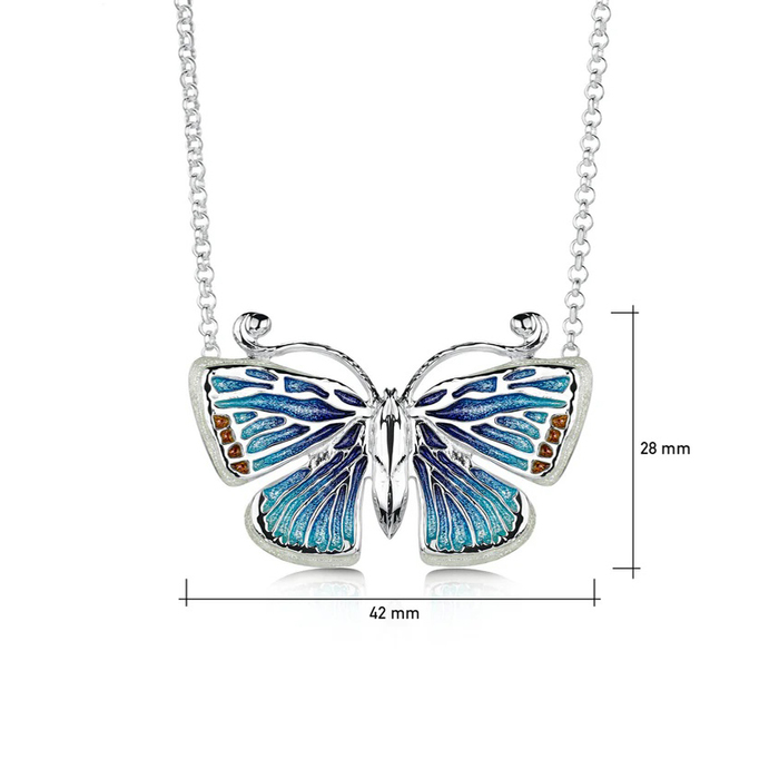 Silver butterfly necklet with common blue enamel colour scheme fixed onto a silver trace link chain, length 18" adjustable to 16".