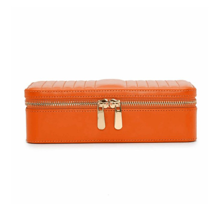 Maria medium zip case, by WOLF. Tangerine stitched leather accented with gold hardware.