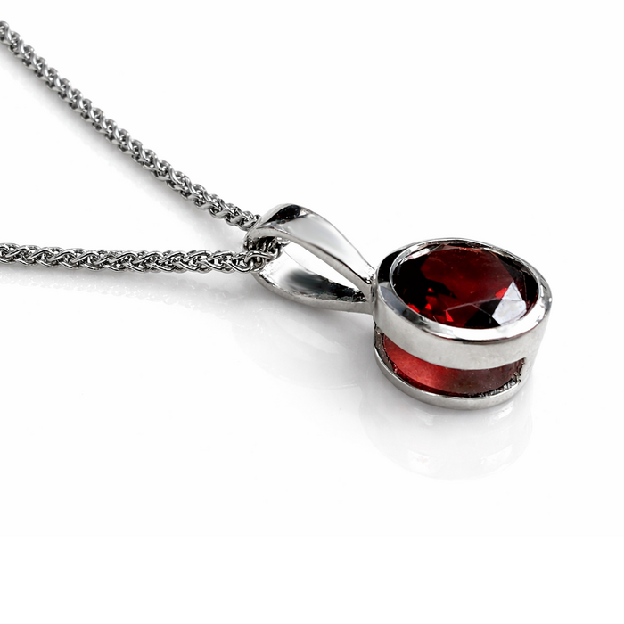 Circular faceted 6mm garnet pendant, 0.85cts., rubover set in 9ct white gold.