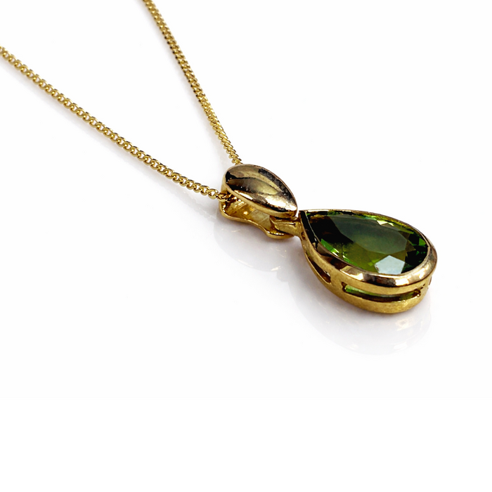 Pear shaped peridot pendant, rubover set in 9ct yellow gold with gold pear shaped top and 45cm curb link chain with 40cm shortener.