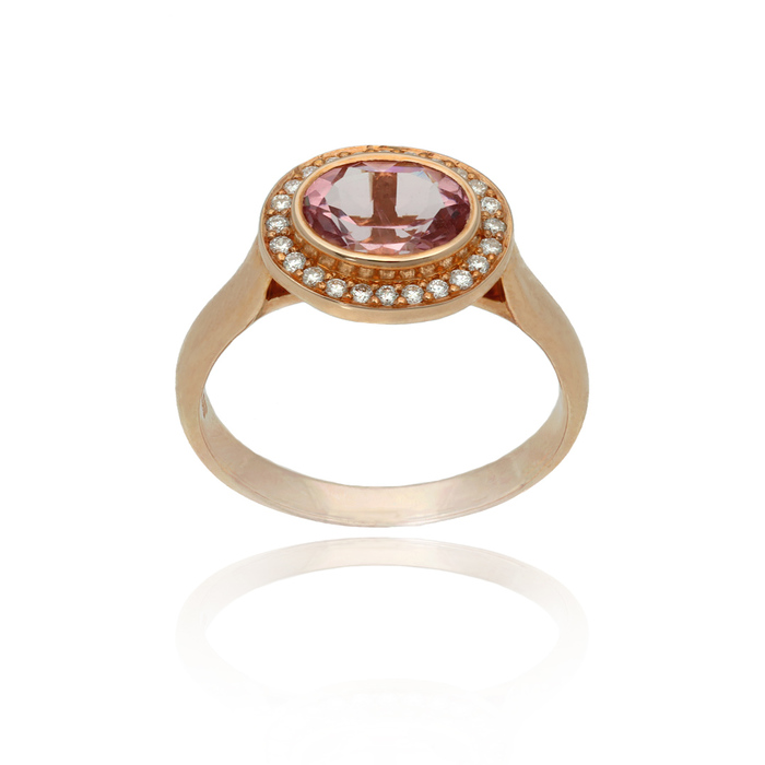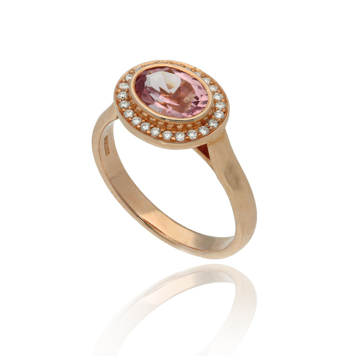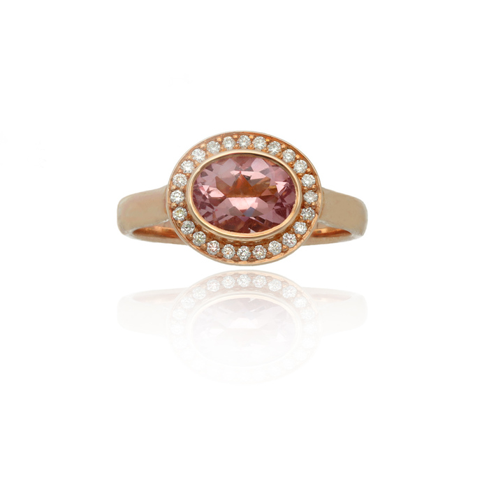 Oval facted 1.11ct Morganite, rubover set 'landscape', within a cluster of 24x round brilliant cut diamonds, combined weight of 0.16cts GVS, grain & thread edge set.