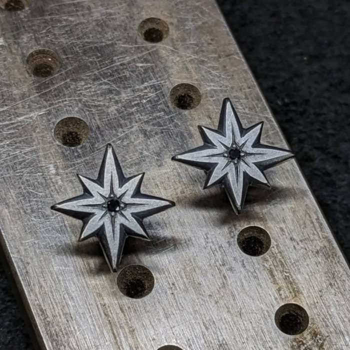 Oxidised silver 8 point star stud earrings, each star set with 1.6mm Ø round black diamond.