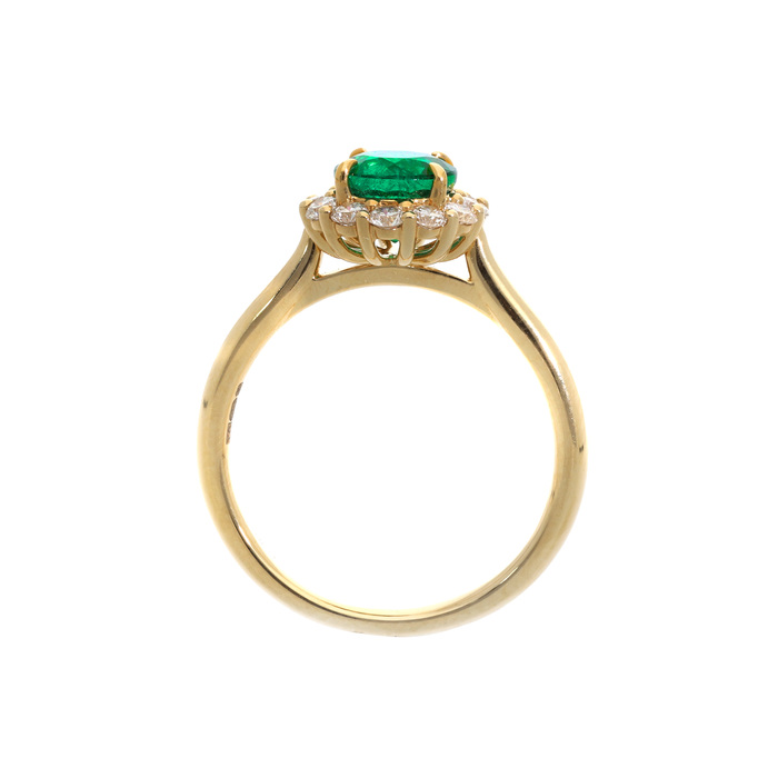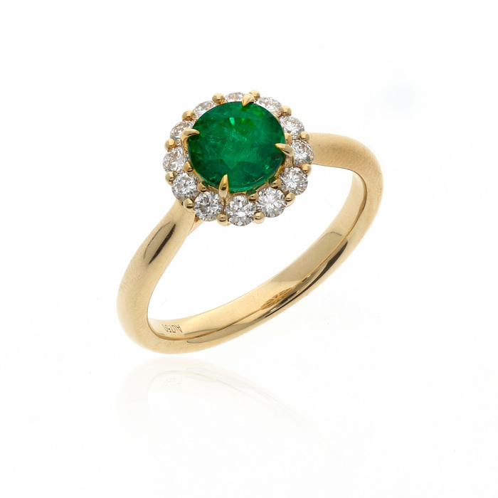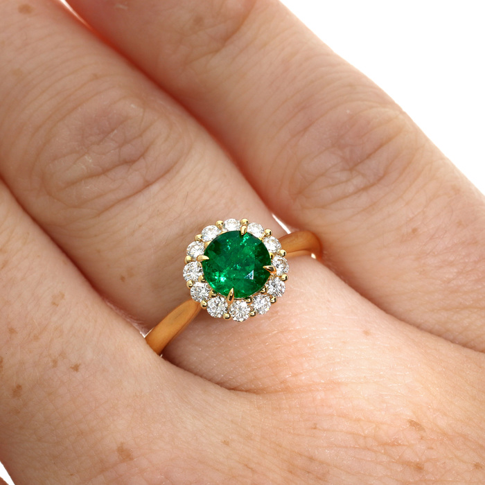 Round faceted 1.12ct emerald, 4 claw set within a cluster of 12 brilliant cut diamonds - combined weight of: 0.43cts, claw set to an all 18ct yellow gold wed-fit mount.