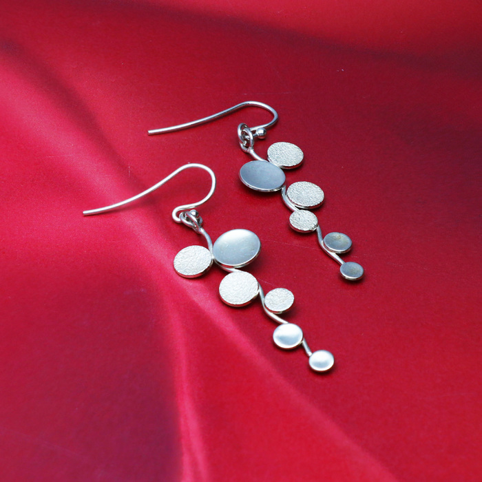 Polished and textured finish silver discs, soldered along a silver wavy wire drop. On hook fittings.