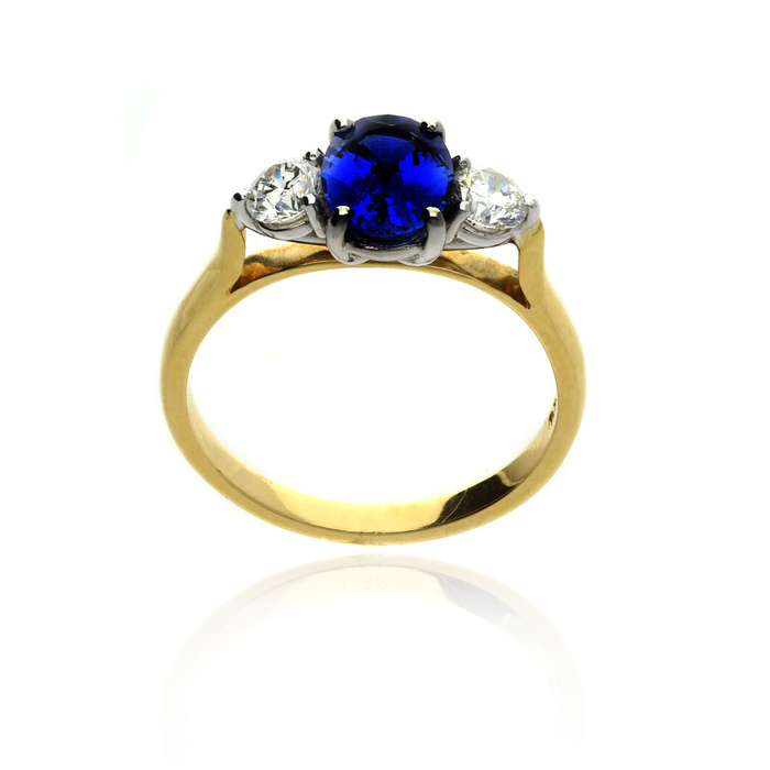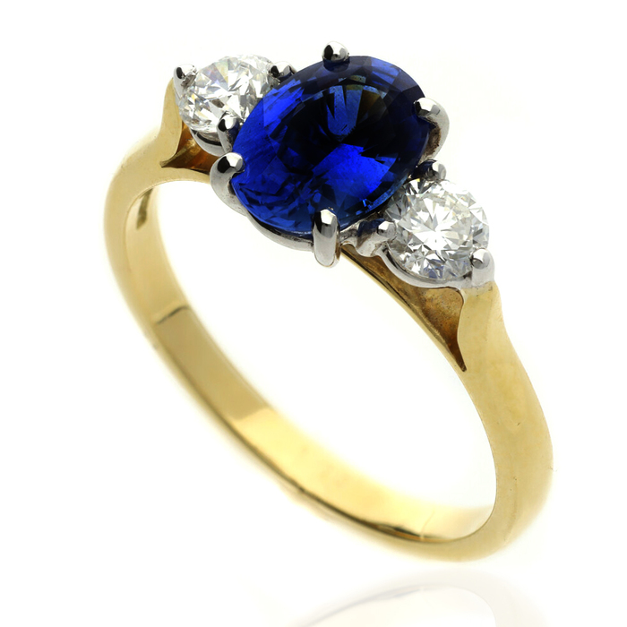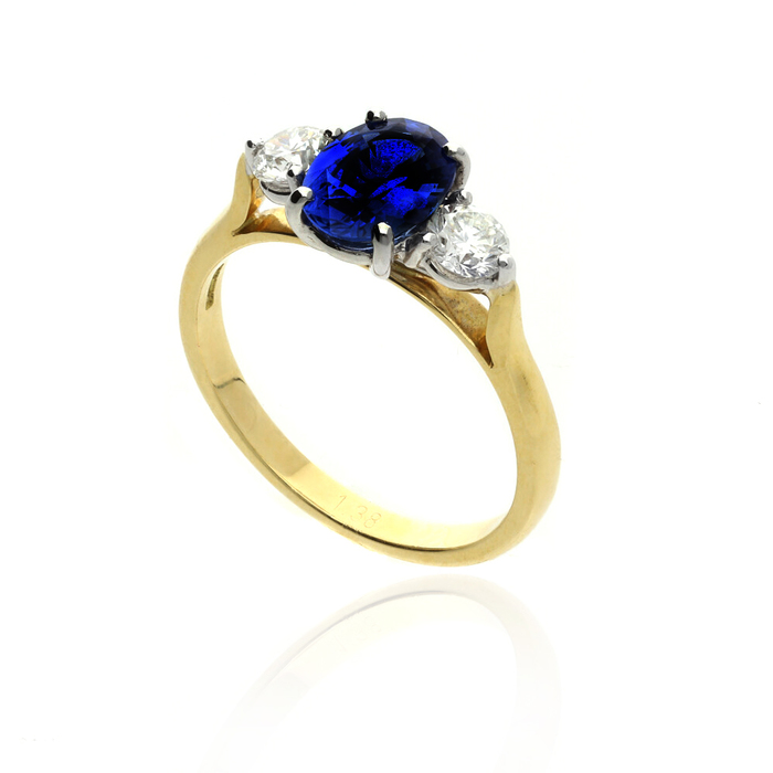 Oval faceted 1.29ct sapphire, 4 claw set with 2 round brilliant cut diamonds (combined weight of 0.44cts), 3 claw set to an 18ct white gold underwire wed-fit head. 18ct yellow gold shoulders and band. Made in England.
