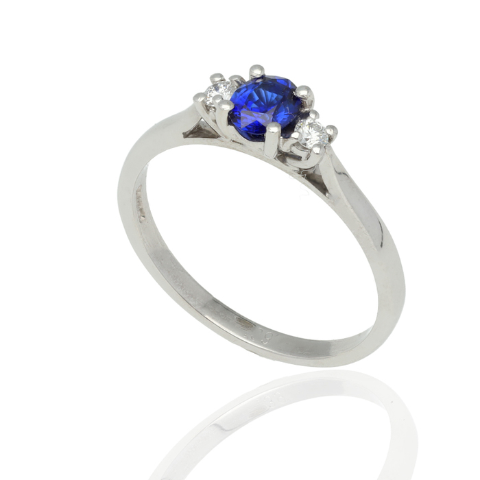Oval faceted sapphire, 0.43ct, with 2 brilliant cut diamonds, 0.08cts GVS, all 4 claw set within an 18ct white gold wed-fit mount.
