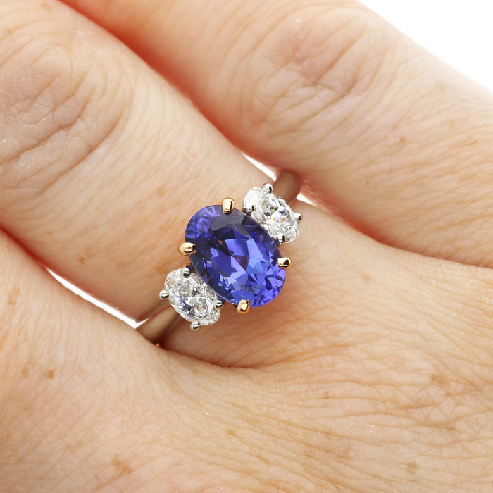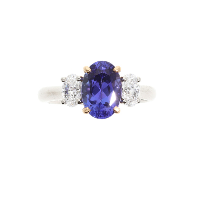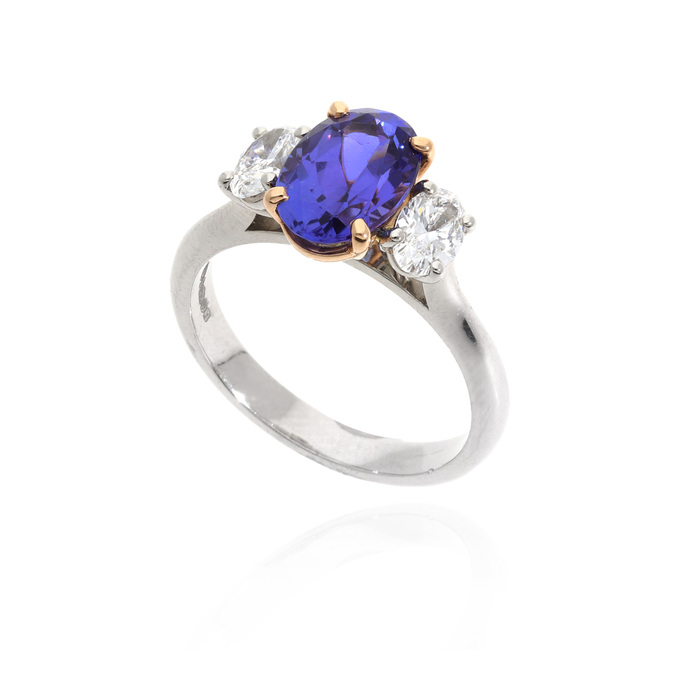 Oval faceted 2.18ct Tanzanite 4 claw set in rose gold. 2 oval brilliant cut GIA certificated diamonds, 0.65cts, 4 claw set in a platinum mount.