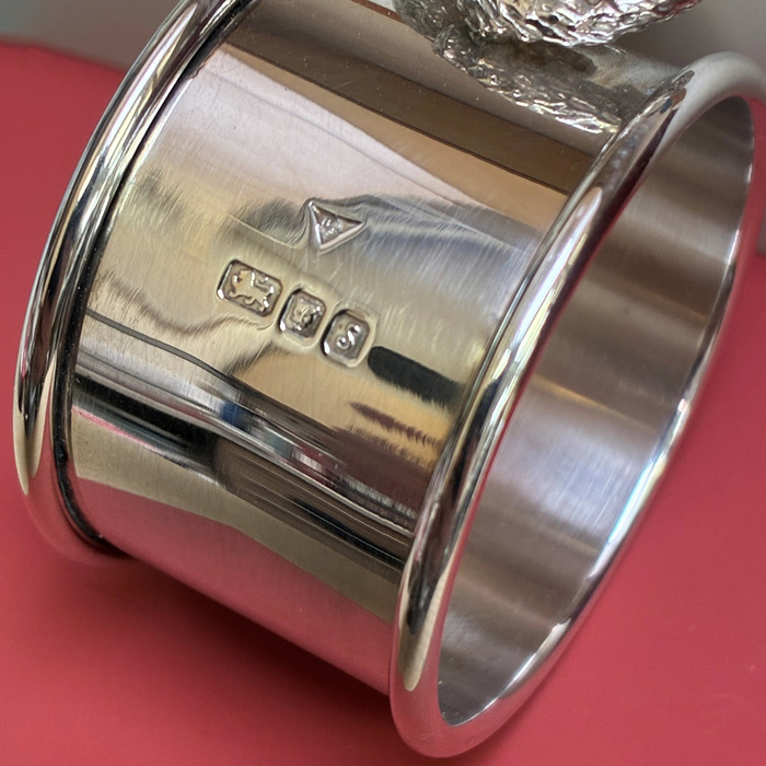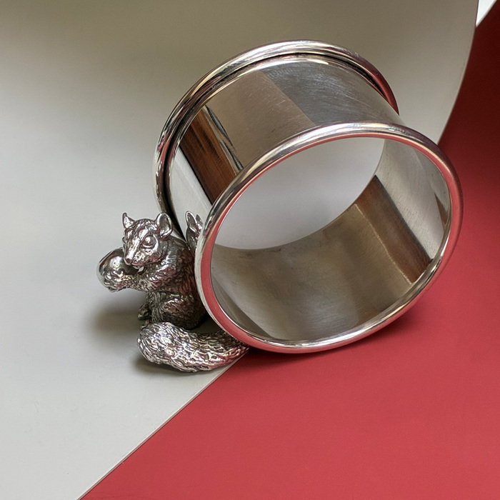 Sterling silver circular napking ring with round wire edges. Set with a squirrel holding a nut.