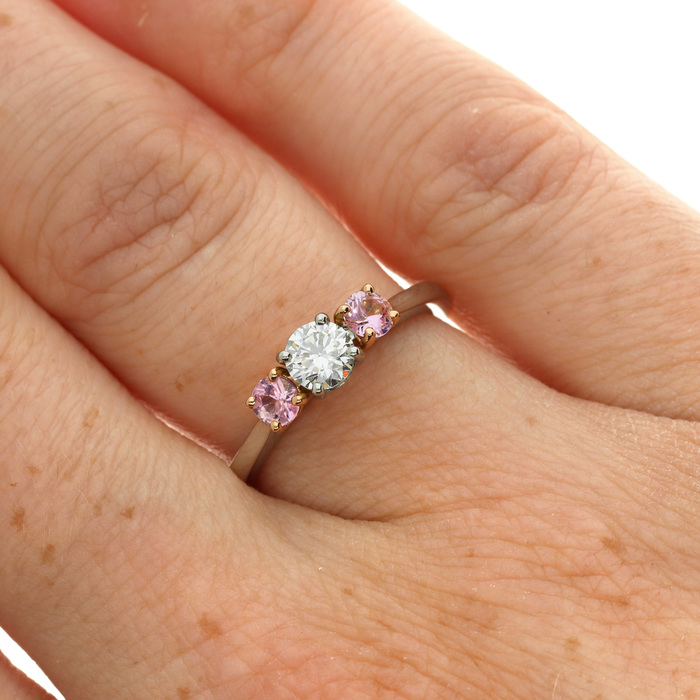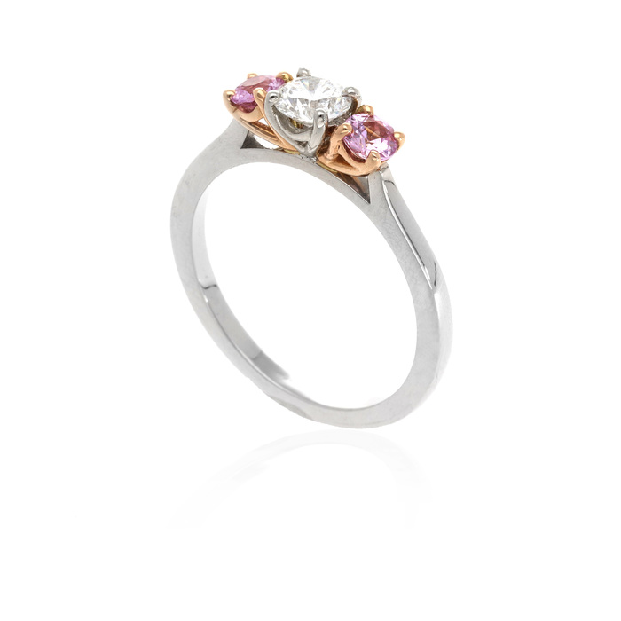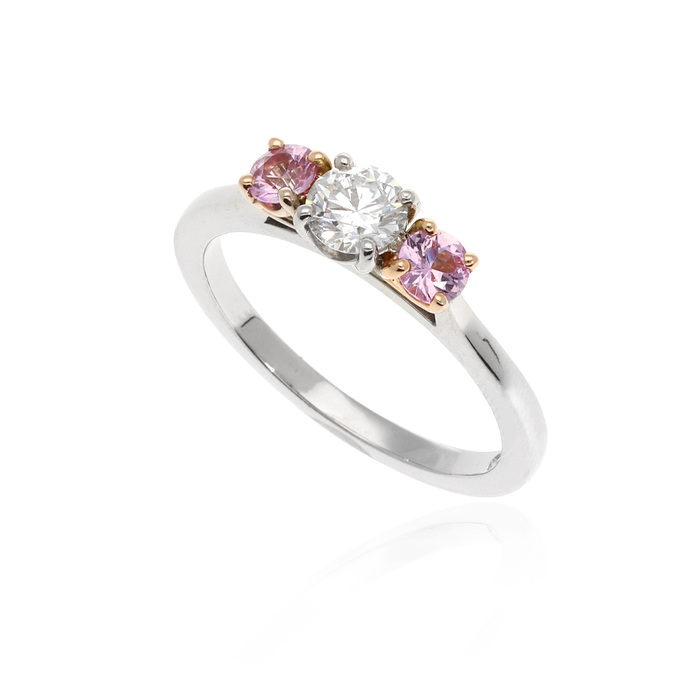 Central round brlliant cut diamond, GIA D VS2 0.40ct, 4 claw set in platinum with 2 diamond cut round pastel pink sapphires, 0.37cts combined weight, 4 claw set in rose gold. Platinum wed-fit bespoke mount.