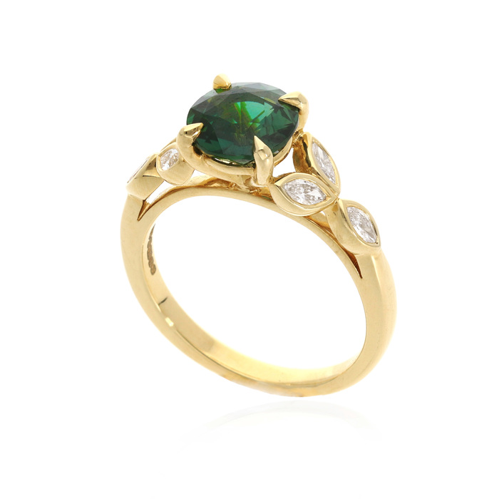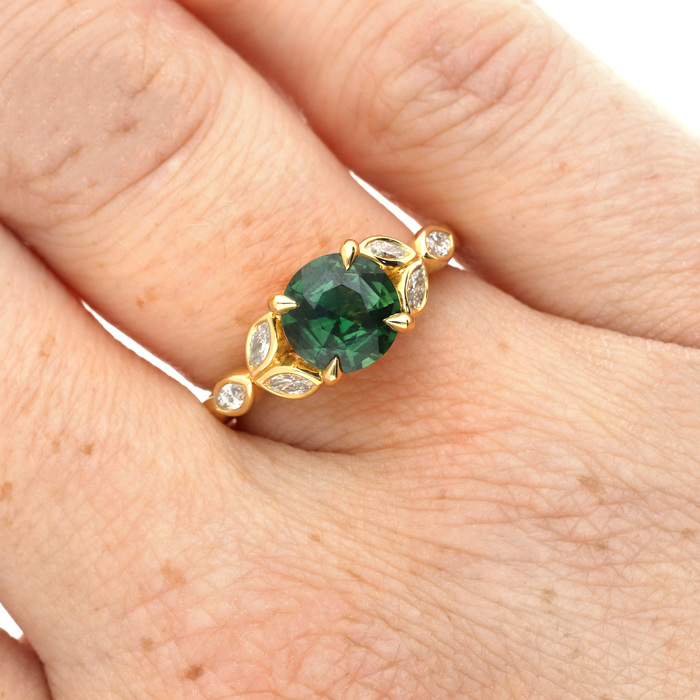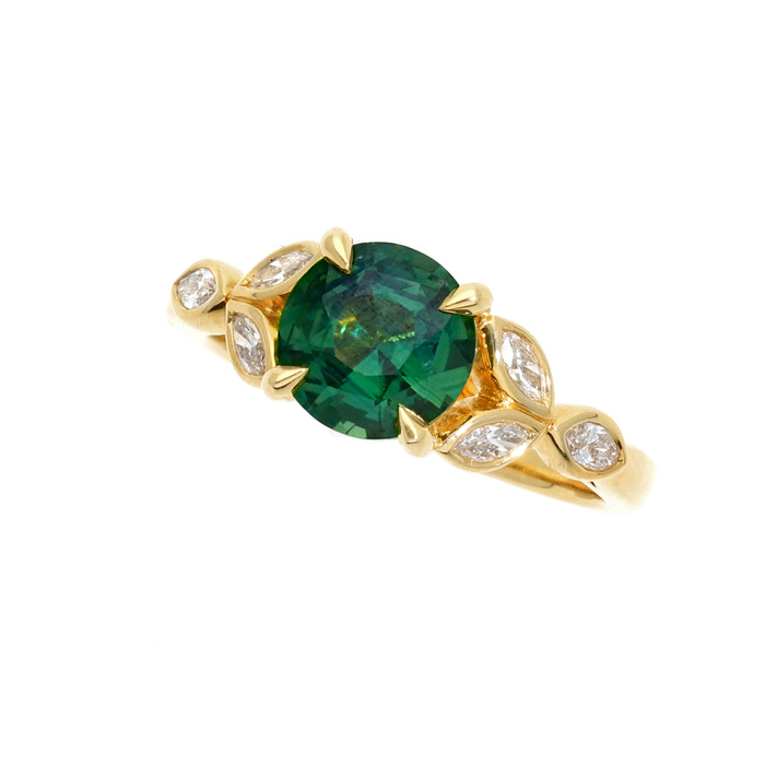 A round faceted 2.05ct fancy bluish green sapphire, 4 claw set with a trio of marquise cut diamonds rubover set to each shoulder. Combined diamond weight: 0.32cts. Wed-fit all 18ct yellow gold mount.