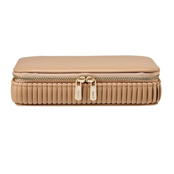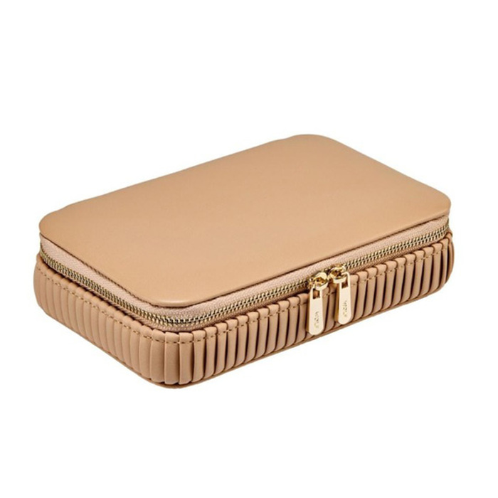 Bella zip case in Mocha, smooth vegan exterior, pleated sides and gold finish hardware.