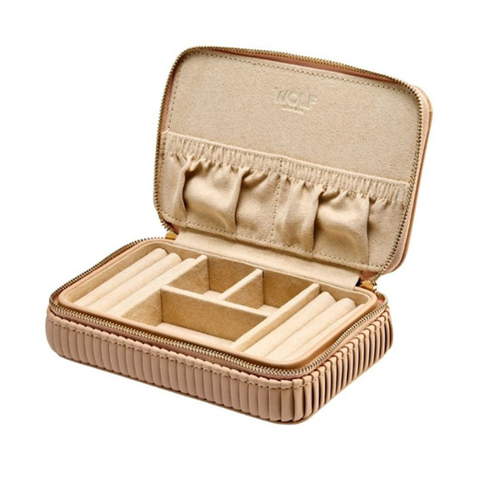 Storage: 3 x LusterLoc™ lined compartments, 2 ring rolls for rings or earrings and 2 additional elasticated storage pouches.
