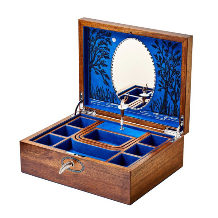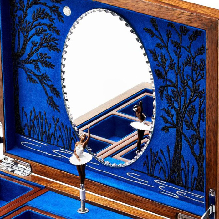 The Ballet collection is inspired by Philipp Wolf III’s original ballerina box. Walnut wood veneer with marquetry detailing, embroidered backdrops surrounding scallop-edged mirror and an interchangeable hand-painted ballet dancer with different skin tones.
