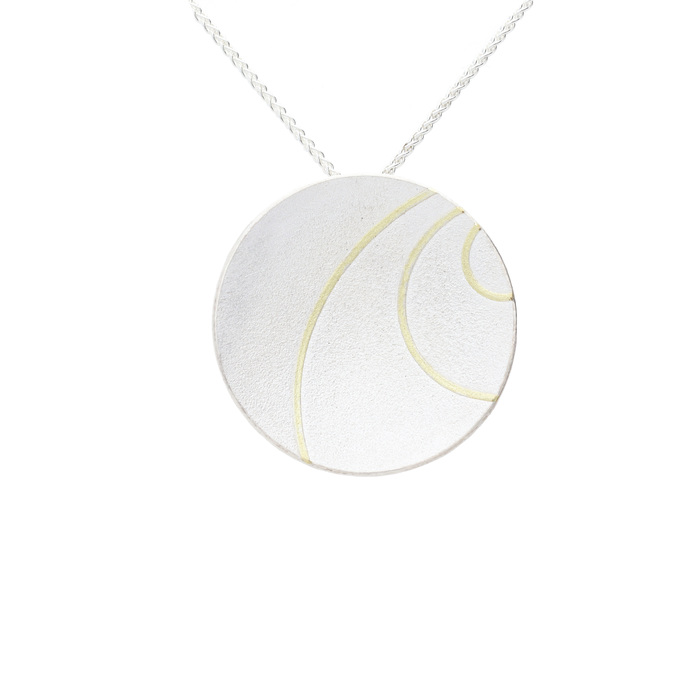 Silver concave disk pendant applied with 3 x 18ct yellow gold wire detail.