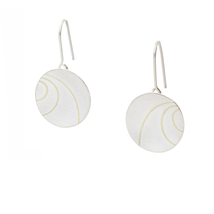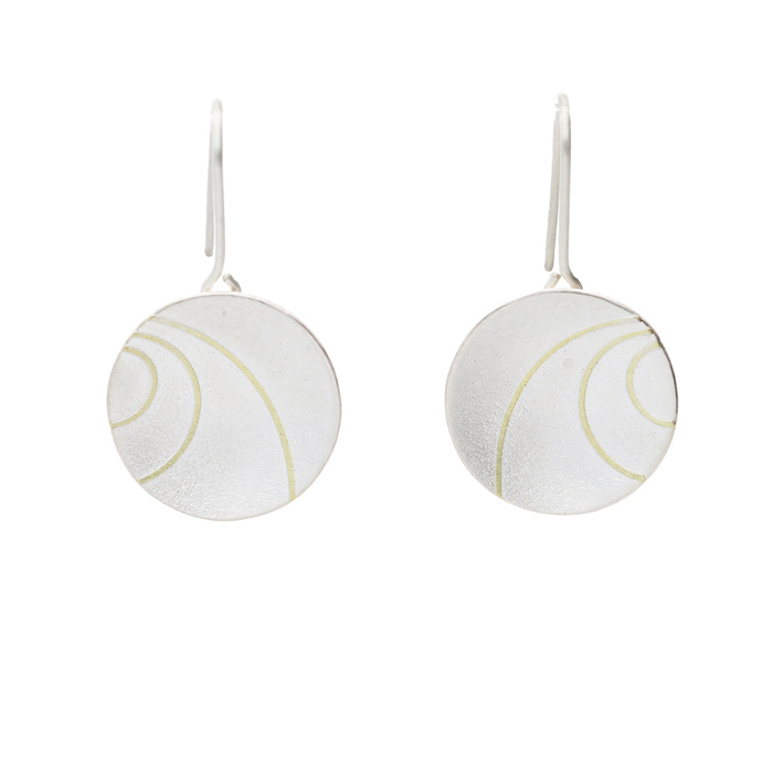 Silver concave disks with applied 18ct yellow gold wire detail, on handmade hook fittings.