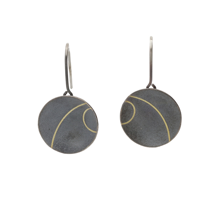 Oxidised silver concave disks with applied 18ct yellow gold wire detail, on handmade hook fittings.