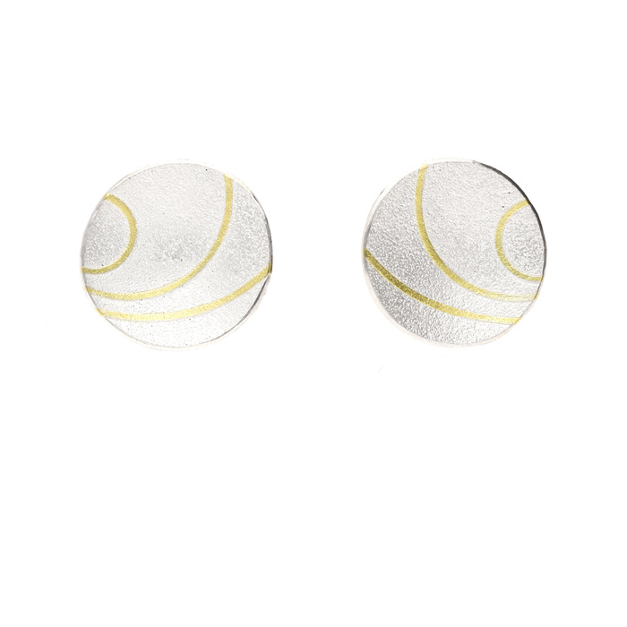 Silver concave disk stud earrings with applied 18ct yellow gold wire detail.