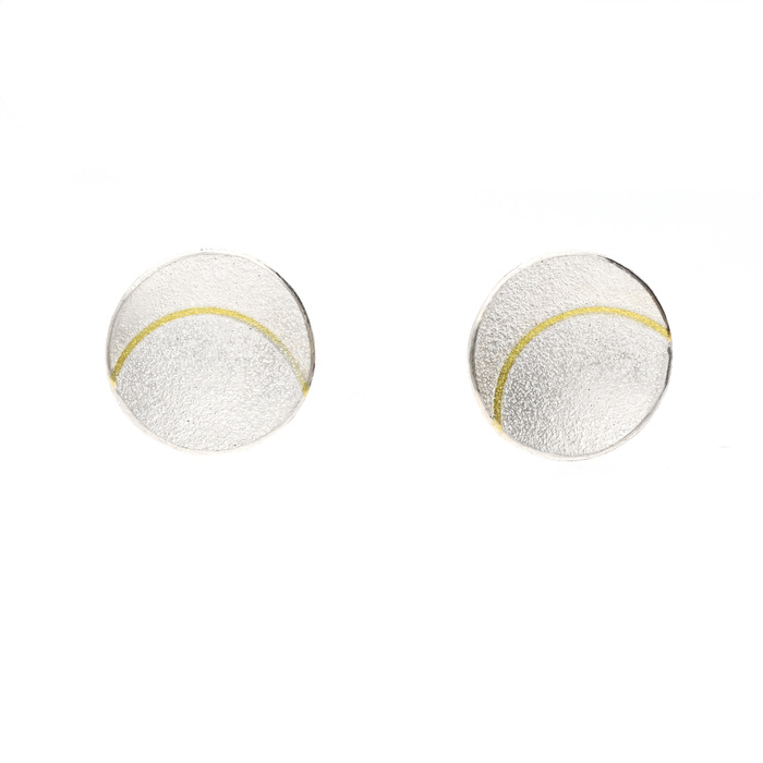Silver concave disk stud earrings with applied 18ct yellow gold wire detail.