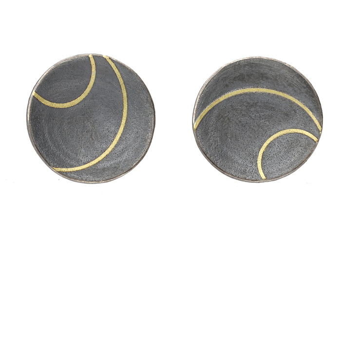 Oxidised ilver concave disk stud earrings with applied 18ct yellow gold wire detail.