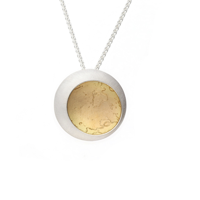 Small silver and gilt etched pendant, 19mm Ø, on 46cm silver spiga chain.