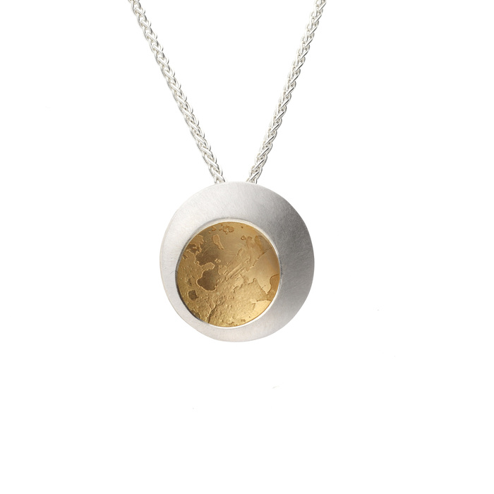 Tiny silver and gilt etched pendant, 15.5mm Ø, on 40cm silver spiga chain.