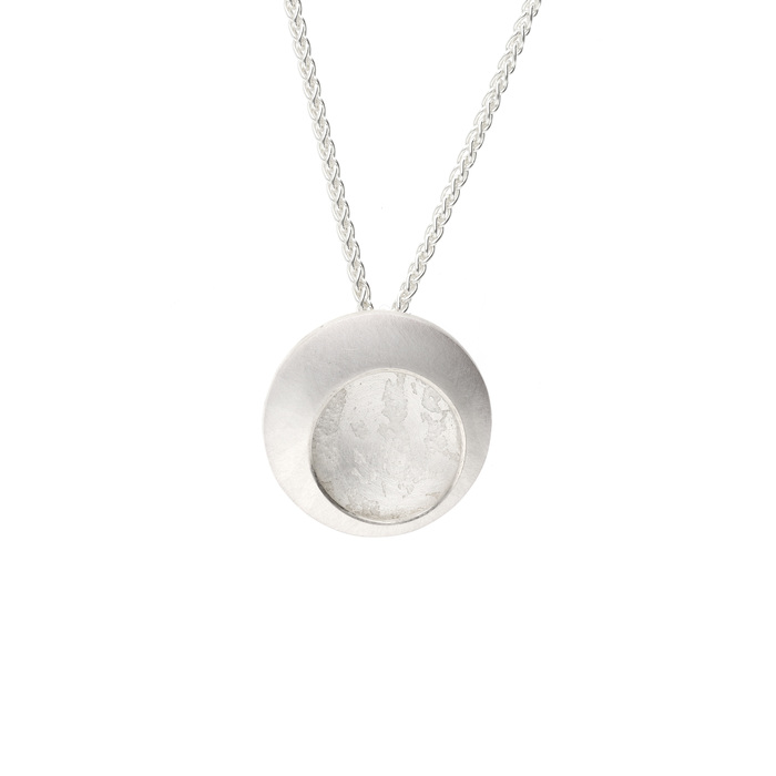 Tiny silver satin etched pendant, 15.5mm Ø, on 40cm silver spiga chain.