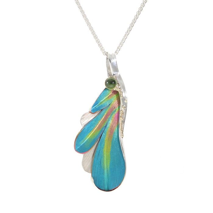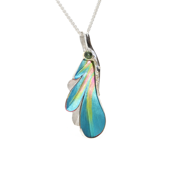 Silver and niobium pendant, blue and yellow niobium. Set with a round cabochon Green Tourmaline rubover set in 18ct yellow gold with bead detail.