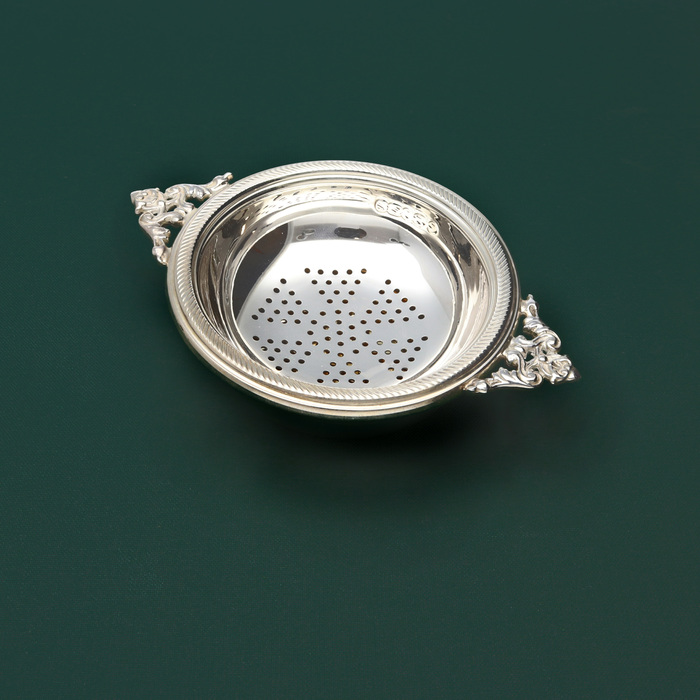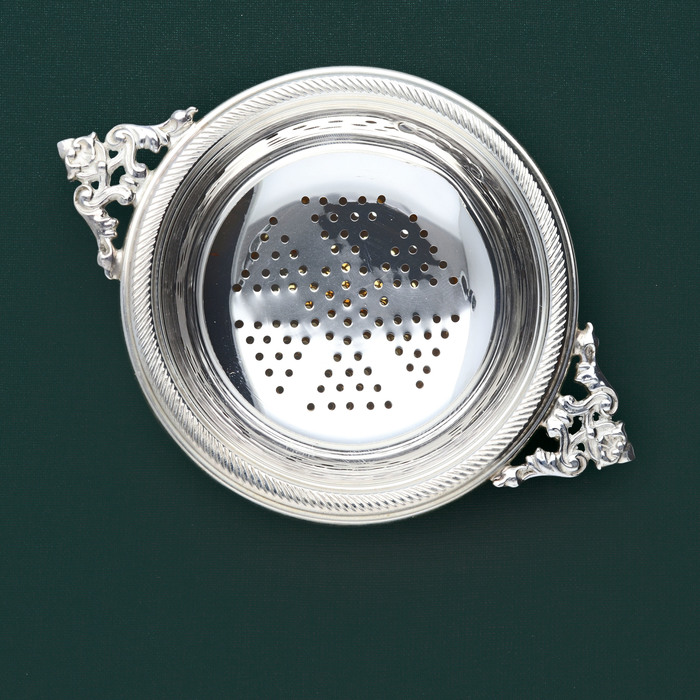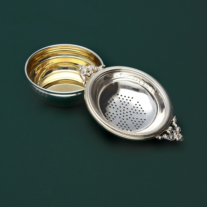 A new sterling silver tea strainer & gilded bowl. Applied corded rim, mounted scroll handles & geometric piercing to bowl.