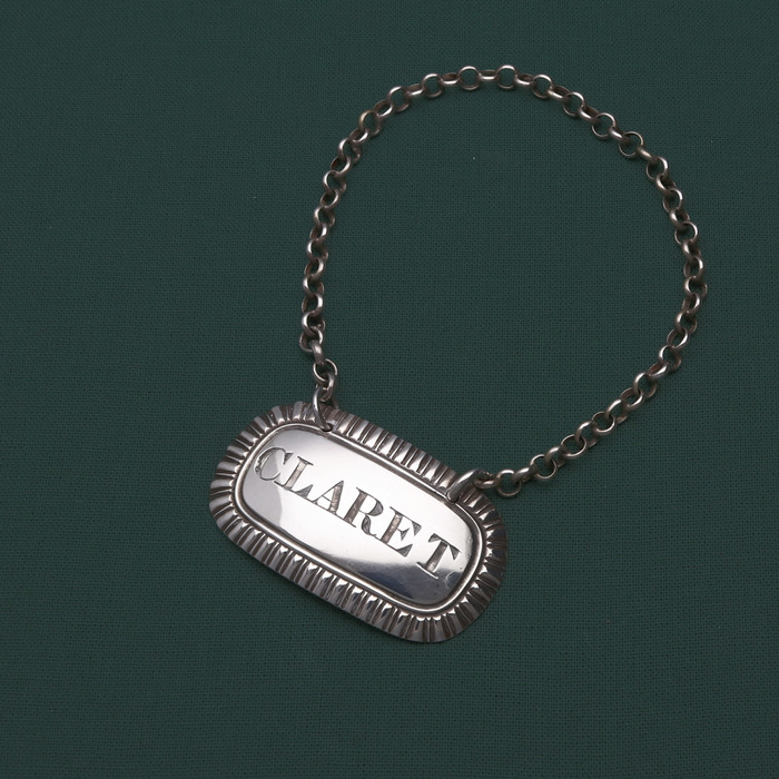 A sterling silver wine label, oval with gadroon border, engraved 'Claret'.