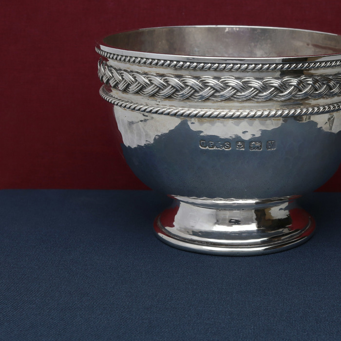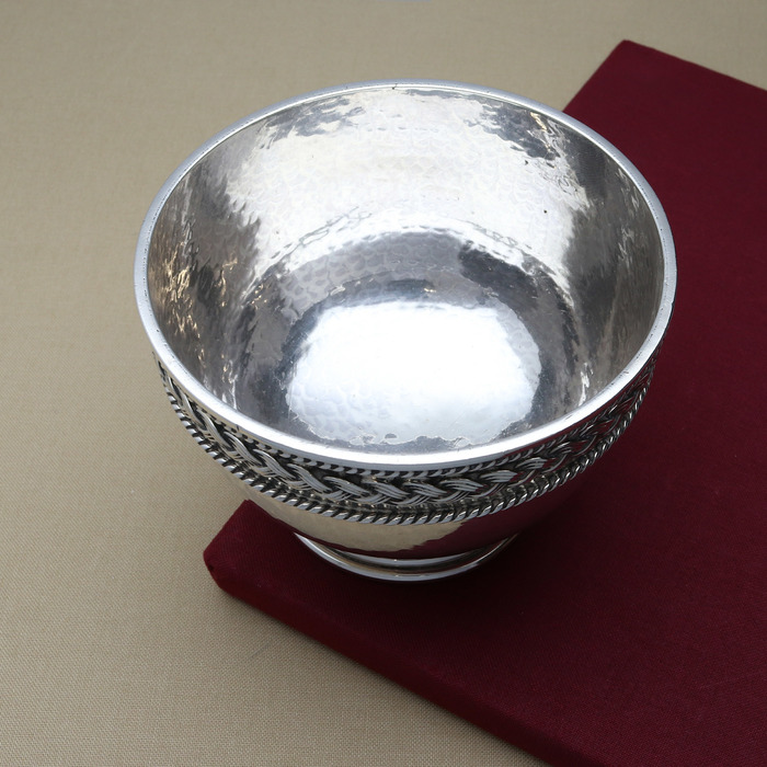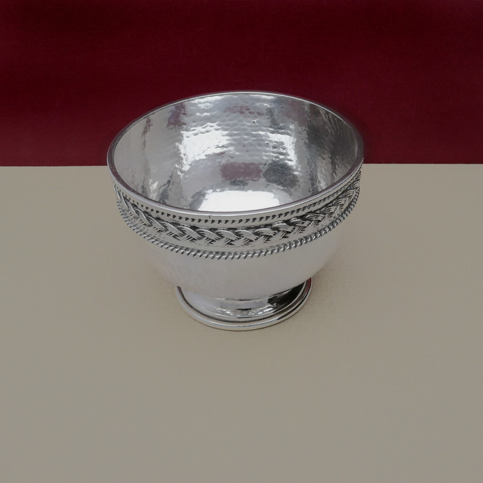Sterling silver bowl, hammered with applied rope border on a circular stepped foot.