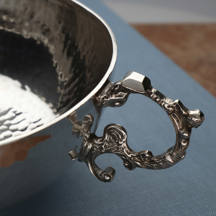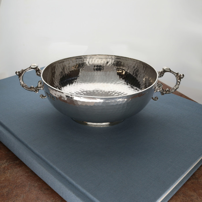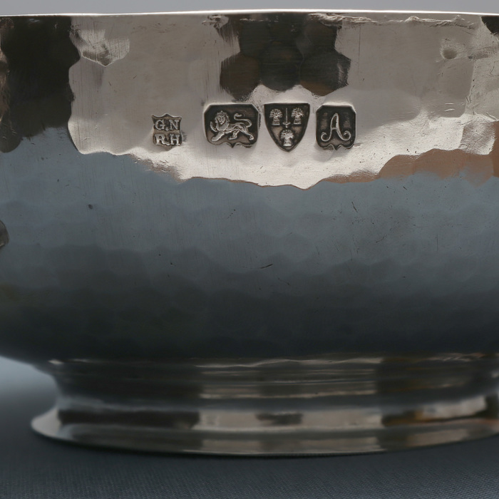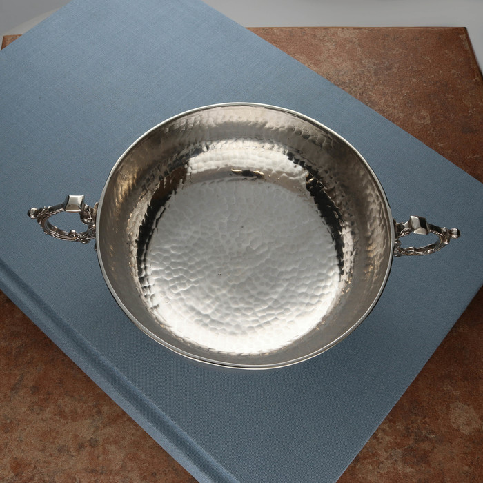 Silver planished bowl with two cherub scroll handles, on plain foot.