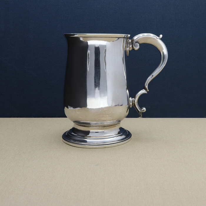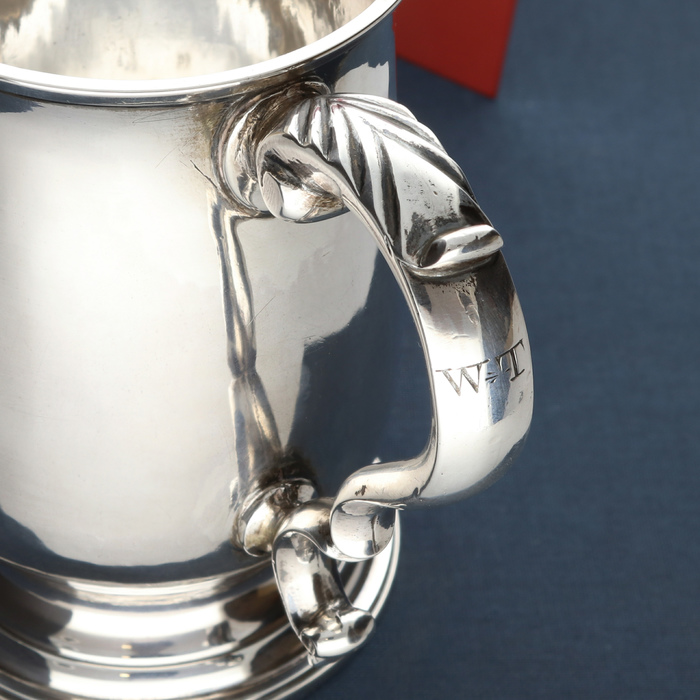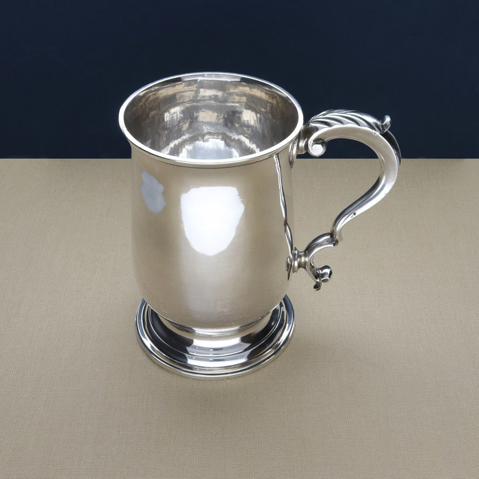 Georgian sterling silver half pint mug, baluster form body with ornate leaf scroll handle.