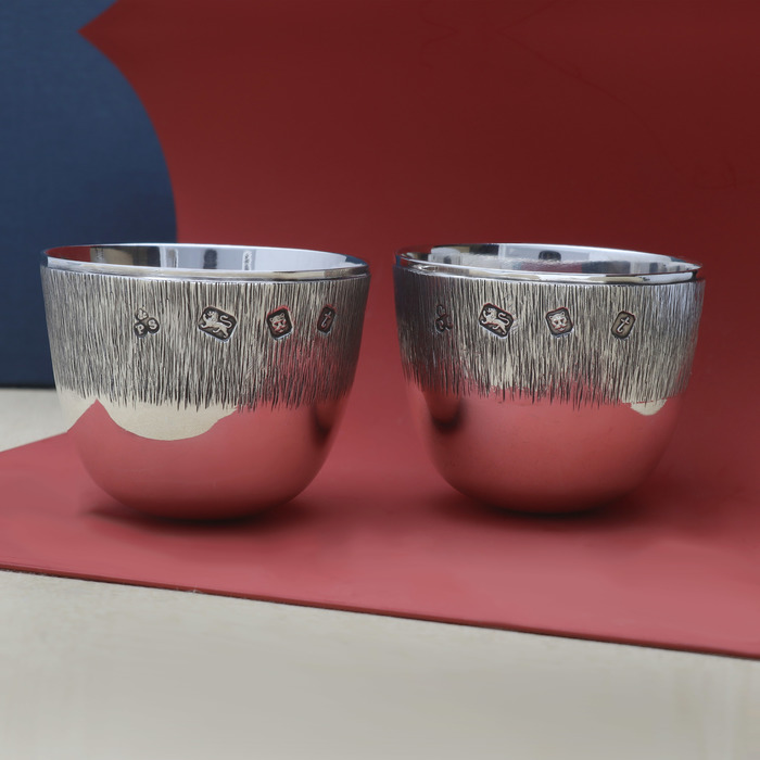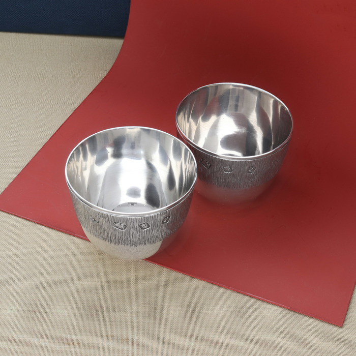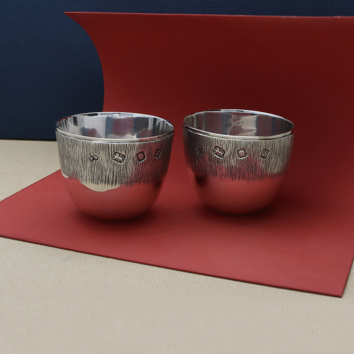 A pair of tumbler cups; Silver with bark texture running from lip and fading towards the centre.