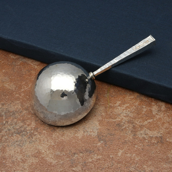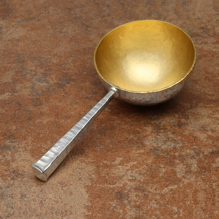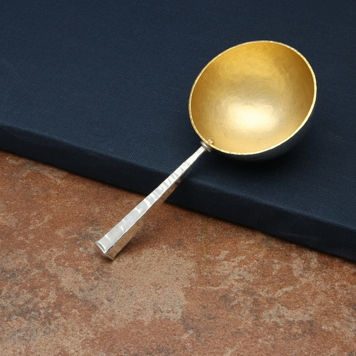 Sterling silver coffee measure, hammered bowl with gilded interior, on a tapering square section handle textured finish.
