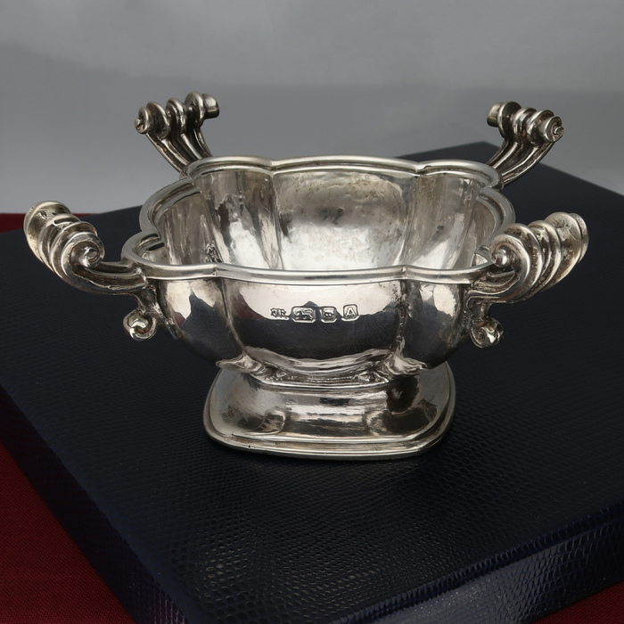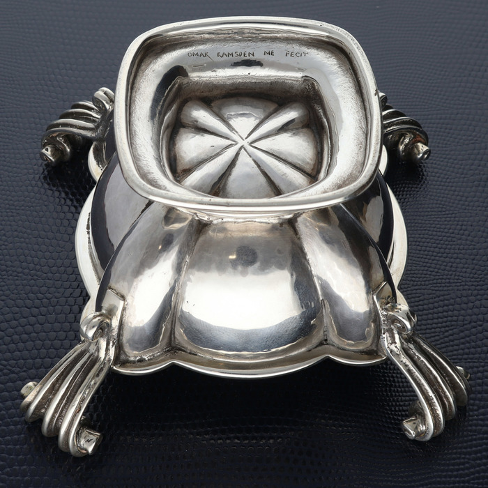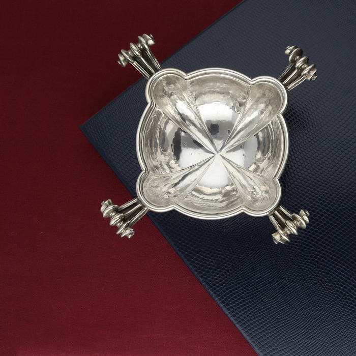 Sterling silver dish, quatrefoil profile, fluted bowl with four flying scroll handles and on a square foot.
