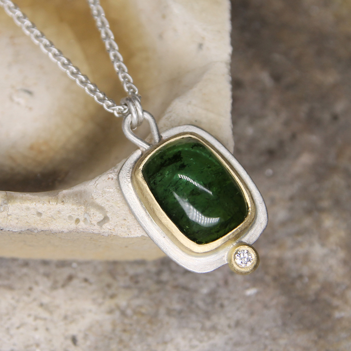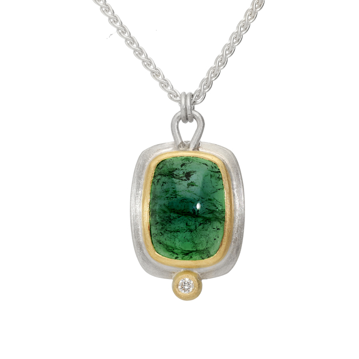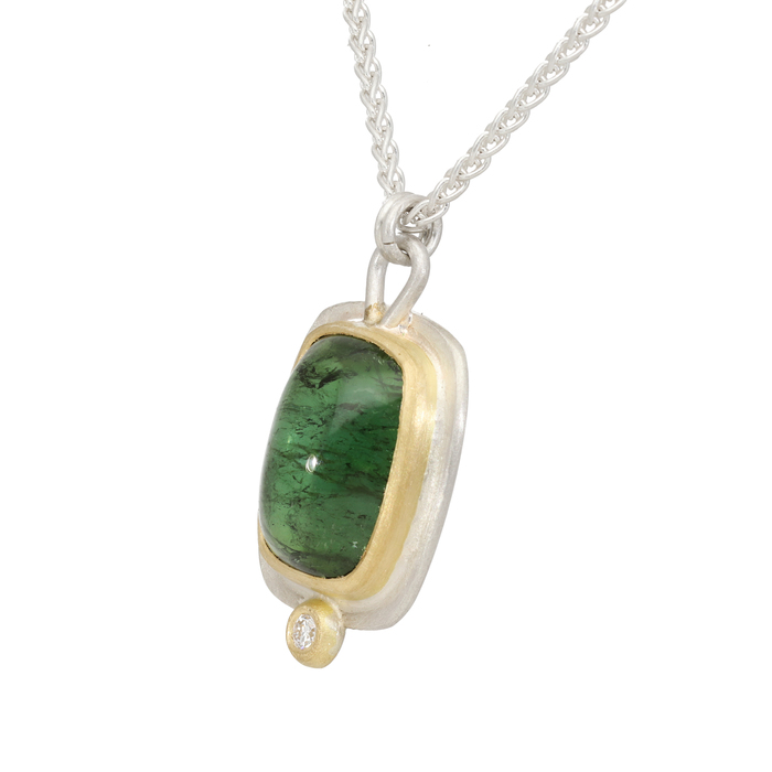 Cabochon cushion shaped green tourmaline, 6.02ct, rubover set in an 18ct yellow gold collet, on a silver mount with a 18ct yellow gold rubover set 2mm Ø diamond beneath.