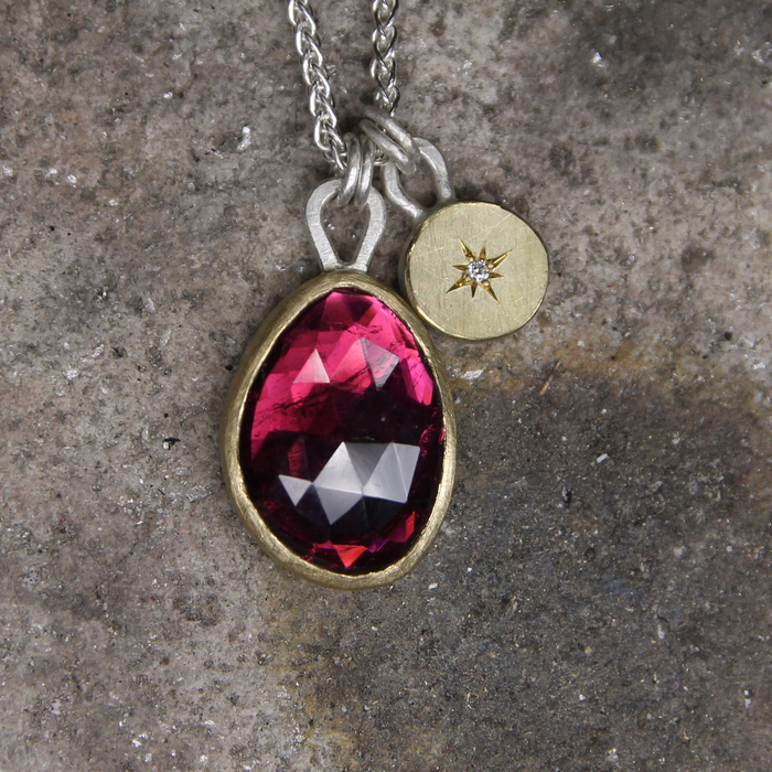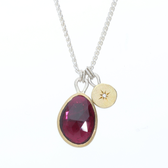 Freeform rose cut pink tourmaline pendant, 4.56cts, rubover set in 18ct yellow gold collet on silver base with a round silver and 18ct yellow gold "coin" pendant, star set with a 1.2mm Ø diamond, by the side.