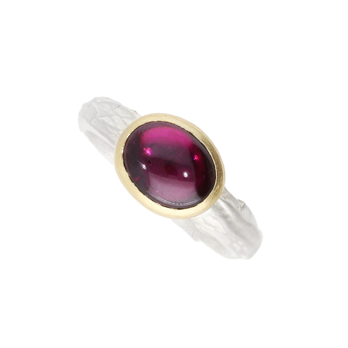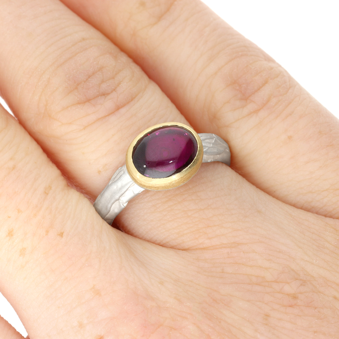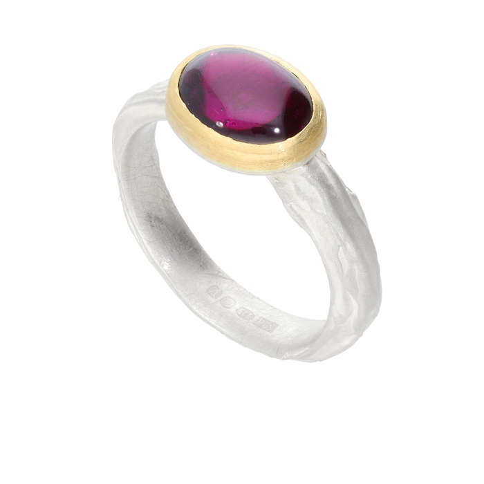 Oval cabochon rhodolie garnet, rubover set in 18ct yellow gold with a textured cast silver ring, 4.2mm wide, matt finish, finger size O½.