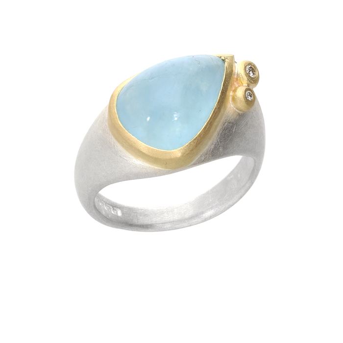 Cabochon pear shaped aquamarine, 7.08ct, rubover set in 18ct yellow gold setting on a silver cast matte finish ring.