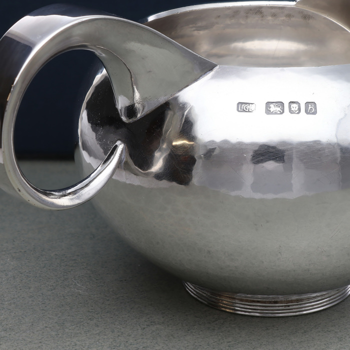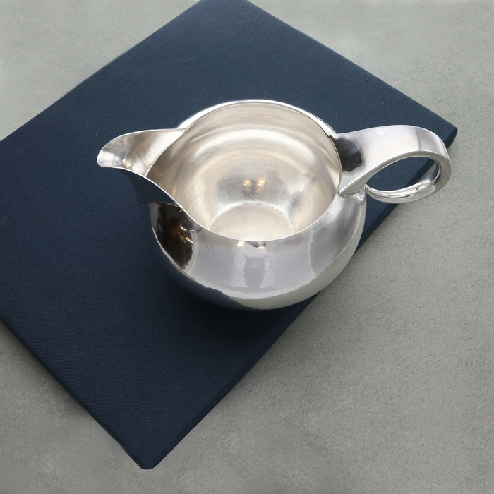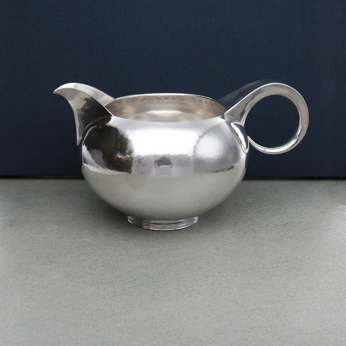 Sterling silver cream jug of circular form with planished surface and polished spout and tapering scroll handle. On a lined wire foot.