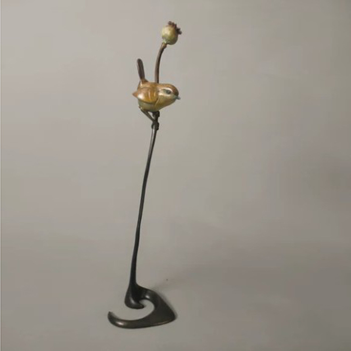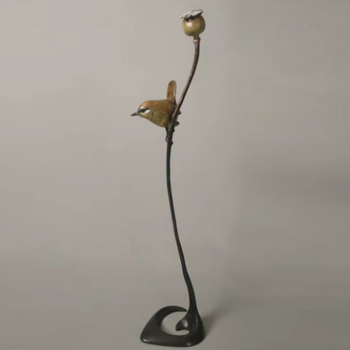 Wren on Poppy bronze sculpture, hand finished patina, 42cm high.