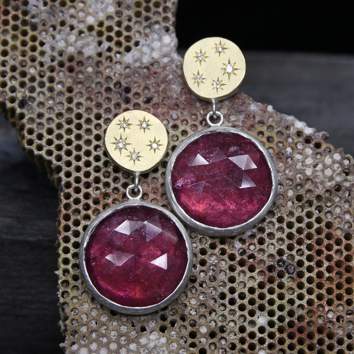 Round rose cut pink tourmaline drops, 21.02cts, on silver and 18ct yellow gold disc studs set with 2 x 1.6mm and 8 x 1.2mm star set diamonds.