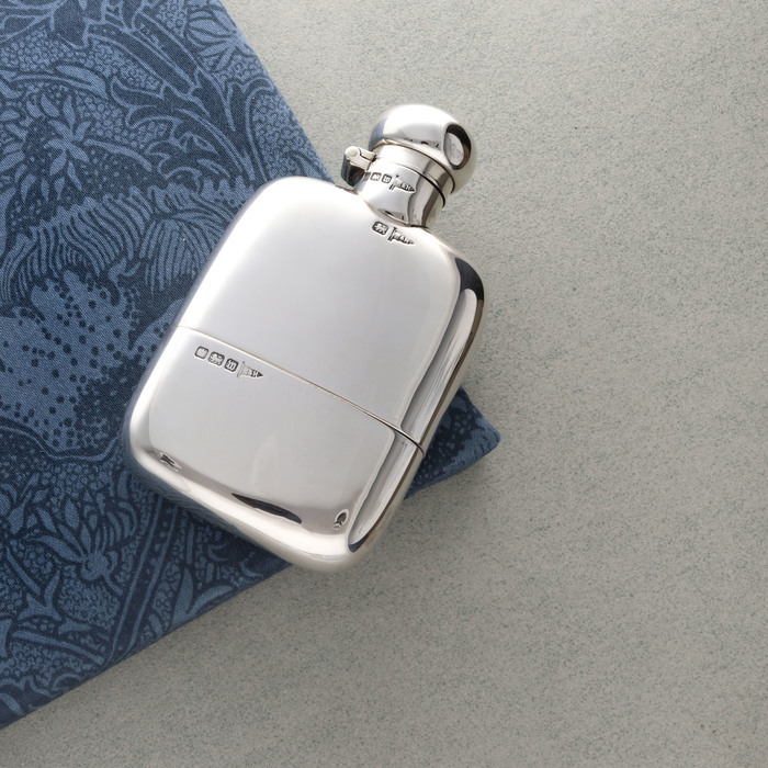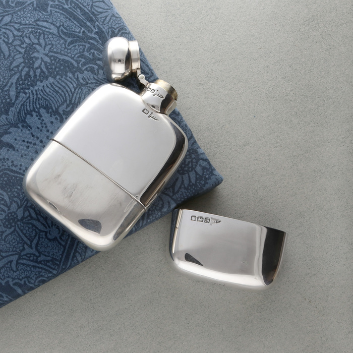 Sterling silver kidney-shaped pocket sized hip flask with detatchable cup gilded interior and captive top.